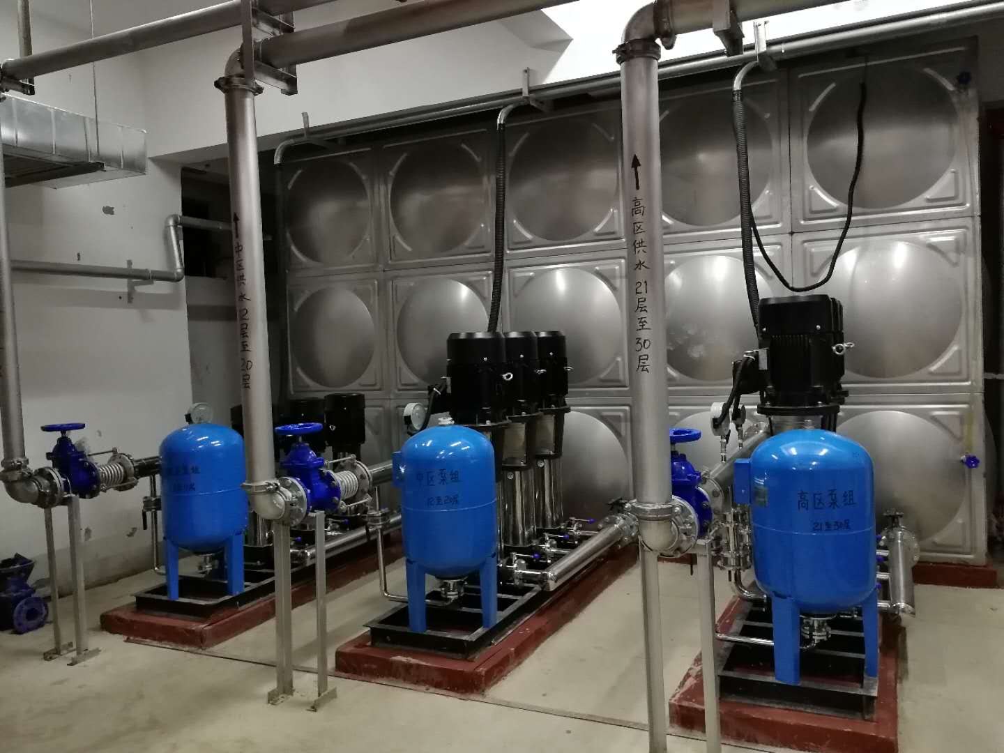 甕安縣公安局新建看守所采用兩用一備恒壓設(shè)備帶水箱,設(shè)備流量設(shè)計為每小時四十立方,揚程五十八米,足夠七八百人每天的常用水量。由于地處比較偏遠(yuǎn)地區(qū),考慮到水壓不夠穩(wěn)定的情況,設(shè)計了長6米,寬5米,高3米的304不銹鋼水箱,以作為水源補充。