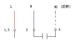 當(dāng)兩繞組完全一樣,電機(jī)可能是三端子接線,1,3為兩繞組的公共接線端,接交流電源的L, 2/4端子之間聯(lián)有啟動(dòng)電容, 如果交流電源的N端接端子2為正轉(zhuǎn),則N改接端子4為反轉(zhuǎn);如果是四端子,見(jiàn)圖四接線;